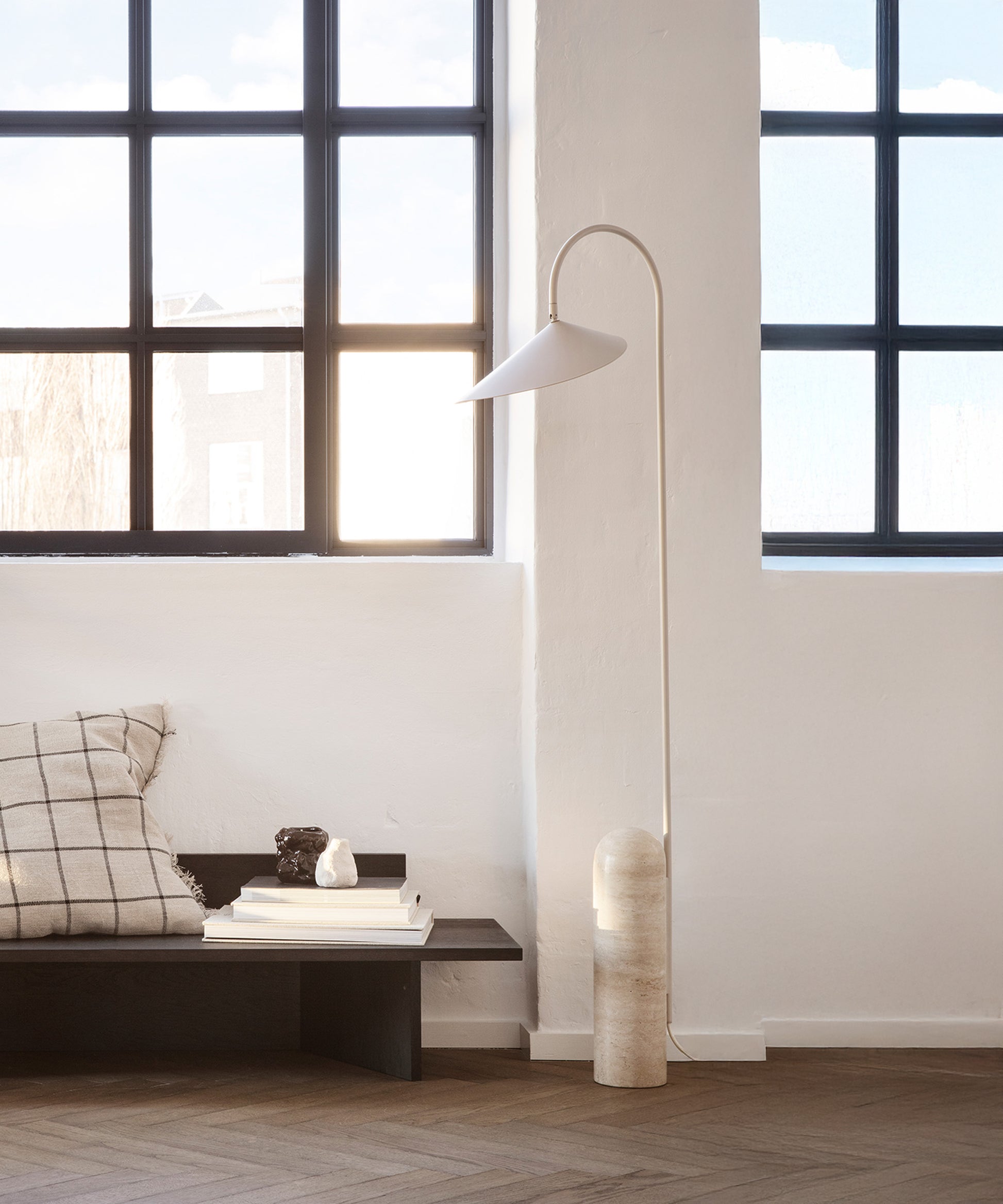 The Travertine Leaf Floor Lamp features a unique design with a solid marble base and a curved metal arch, giving it an organic touch. The off-centre structure is perfectly balanced, with the black marble foot providing a counterweight to the suspended lampshade. The matte, off-white interior of the shade diffuses a soft and evenly distributed light, which can be adjusted for optimal lighting in any situation.