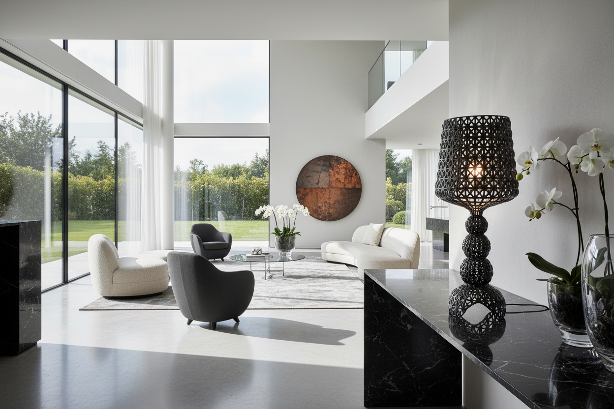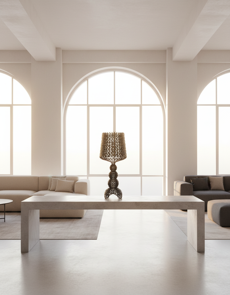 The Phantom floor lamp utilizes innovative injection molding technology to create a delicate, lace-like structure with a distinct perforated surface, diffusing light in a truly unique way.